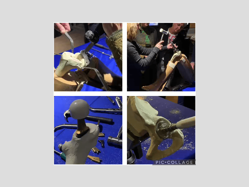 met veel enthousiasme uitleg gaven over het plaatsen van een prothese en de fysiotherapeuten zelf aan de slag mochten met boor, zaag en beitel.