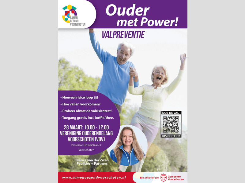 Op vrijdag 28 maart a.s. organiseert Samen Gezond Voorschoten opnieuw een bijeenkomst Valpreventie van 10 tot 12 uur op Prof Einsteinlaan 3. Tijdens deze bijeenkomst krijgt u van fysiotherapeut Bianca van der Zwan informatie en tips om uw valrisico te verkleinen. Bent u er ook bij?