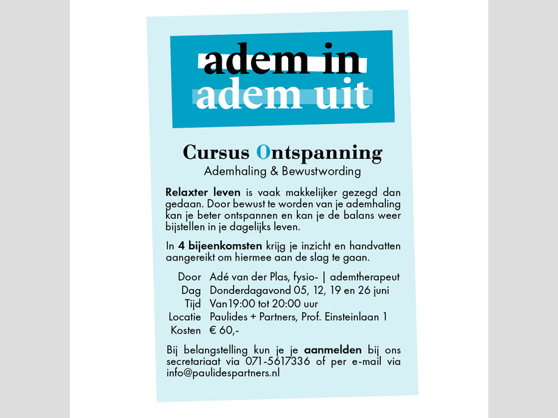 We starten donderdag 5 juni weer met een nieuwe cursus 'Ontspanning, ademhaling en bewustwording'. Er zijn nog enkele plekken vrij!