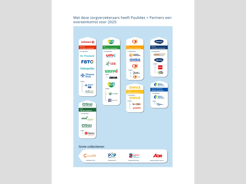 Hieronder ziet u een overzicht van de zorgverzekeraars met wie Paulides + Partners voor 2025 een contract heeft afgesloten.